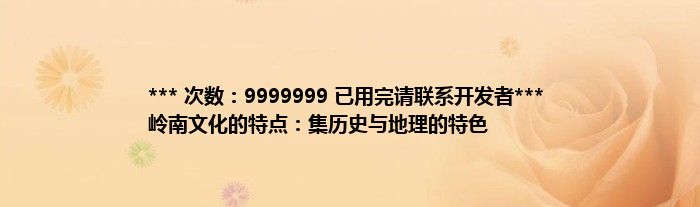 本文*** 次数:9999999 已用完请联系开发者*** 岭南文化的特点:集历史与地理的特色到此分享完毕,希望对大家有所帮助。