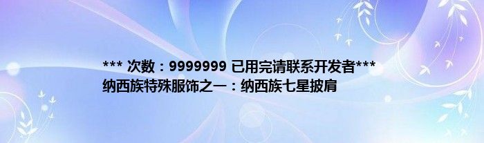 本文*** 次数:9999999 已用完请联系开发者*** 纳西族特殊服饰之一:纳西族七星披肩到此分享完毕,希望对大家有所帮助。