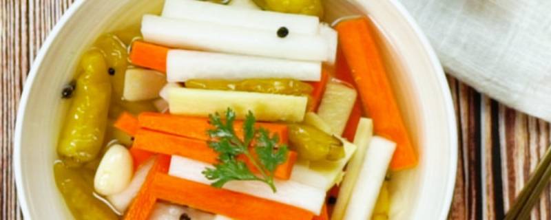 2、碗中倒入白萝卜、胡萝卜,加入盐,腌制20分钟。