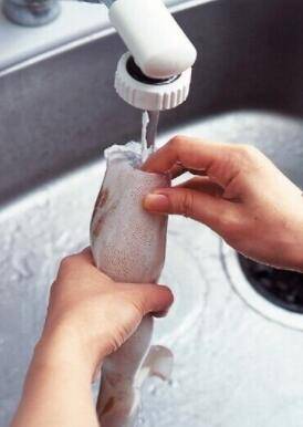 9、在乌贼足部中心有坚硬的口器,以指尖朝口器推压,然后将它拉出来。
