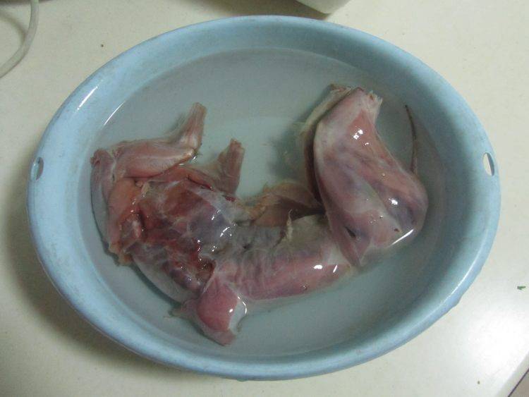 1、将野兔泡上一天,当血水泡出后要不停的换水。