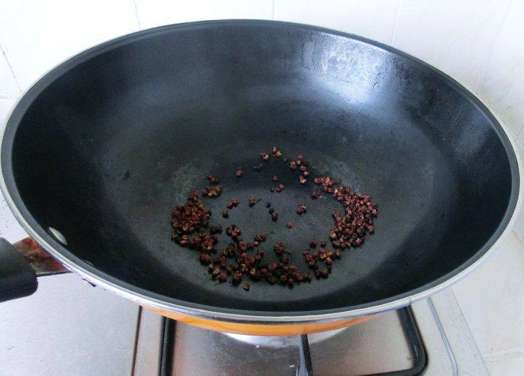 5、将10克花椒粒放入干锅中炒香(锅内不用放油)。