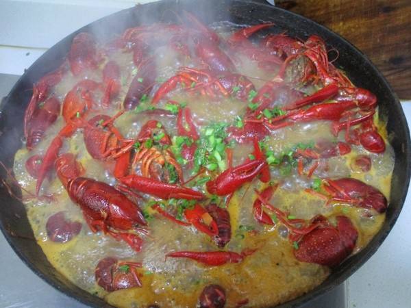 8、烧到小龙虾熟透后倒入葱花即可出锅。