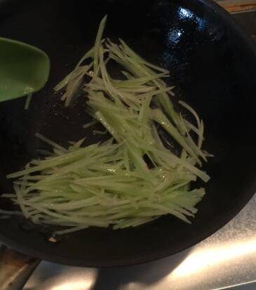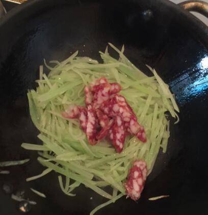 2、爆炒青丝。青笋熟软时下香肠。