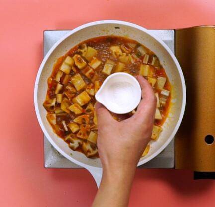 倒入生抽,翻炒均匀,倒入水10毫升,翻炒均匀,倒入盐、白砂糖,翻炒均匀。