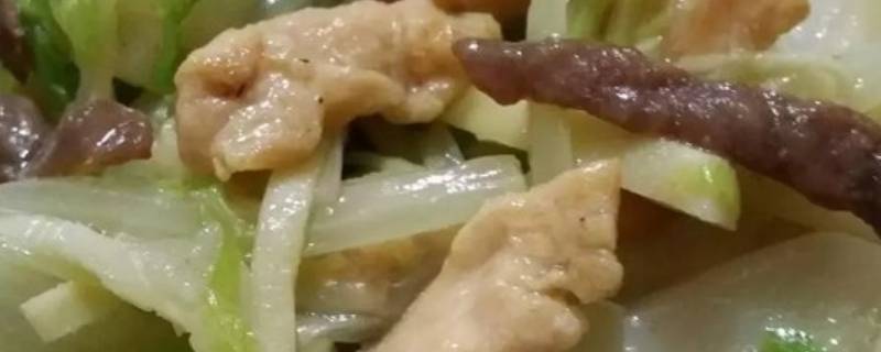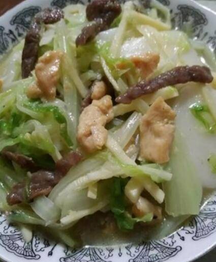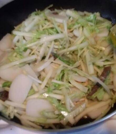 6.留底油煸炒胶菜丝,倒入年糕继续翻炒一下,加适量的水或者高汤,煮至年糕软,再倒入煸炒过的冬笋丝、鸡丝、牛柳,翻炒均匀,盐,胡椒粉调味,如果鸡丝牛柳早放的话会老掉,所以晚点才放下去。