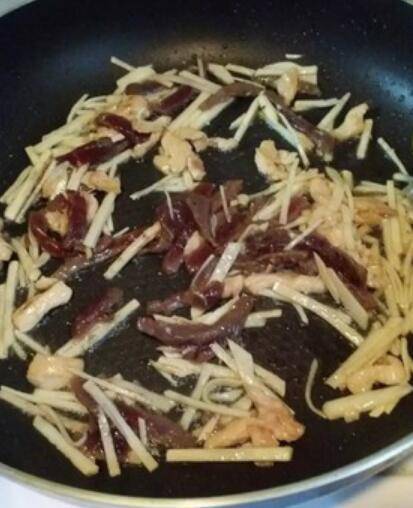 5.平底锅放油煸炒冬笋丝、鸡丝、牛柳,然后盛起。