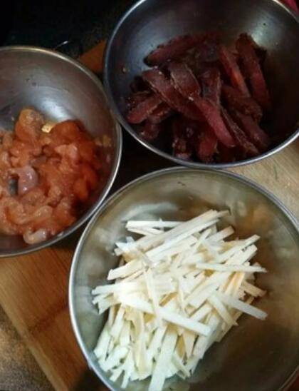 4.切成丝,牛排切成牛柳;鸡腿肉切丝,用料酒、盐、白胡椒粉、淀粉腌制一下。