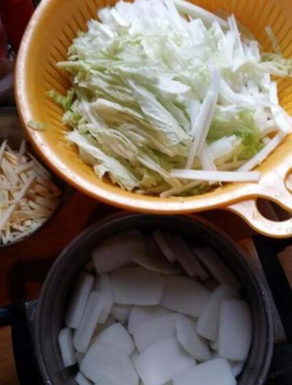 2.冲洗干净切丝待用,年糕冷水浸泡待用。