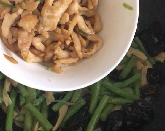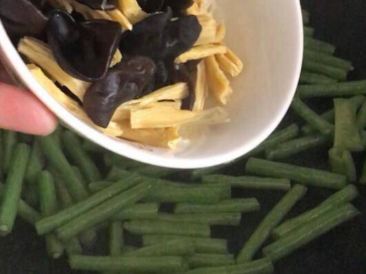 7、用炒鸡肉的油炒配菜,先将豆角炒变色,然后下腐竹和木耳,加一勺高汤盖锅焖几分钟,然后加点盐调味。