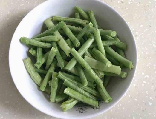 2、豆角清洗干净,摘去两头,掰成寸段。
