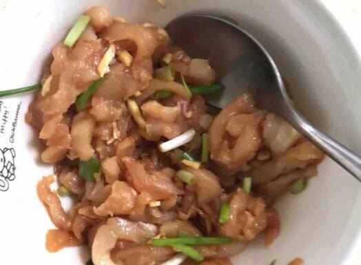 4、葱白生姜鸡肉放在大碗里,加盐、糖、酱油、淀粉和胡椒粉调拌均匀备用。
