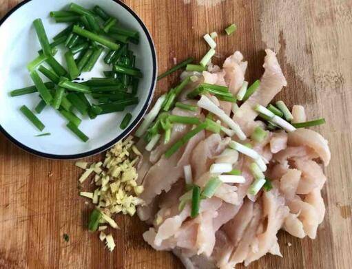 3、鸡肉切丝,小葱葱白葱叶分开切好,生姜切末。