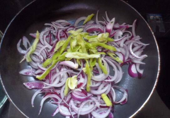 2、热锅倒油放入洋葱、青椒丝盐煸炒熟盛出。