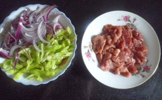 1、牛排、洋葱、青椒切丝。