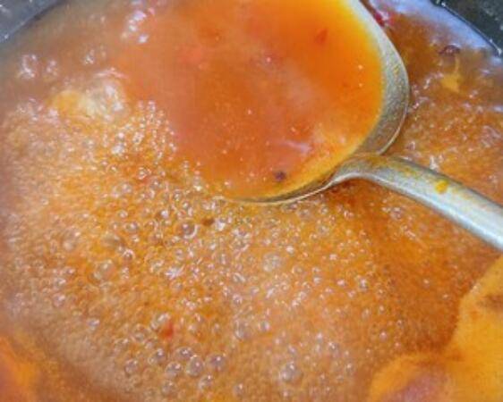 2、起锅烧油,加入姜片,葱段,花椒,大料炸糊,捞出。放入豆瓣酱和牛油火锅底料炒出香味,倒入开水,荔枝罐头的汤汁和水淀粉熬制黏稠。