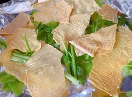 1、鱼用姜片,葱,料酒腌制1小时。莴笋切片,芹菜段,油豆皮铺好烤盘。