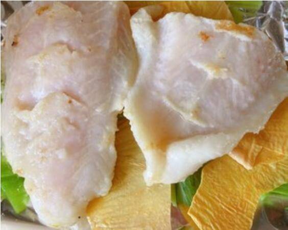 3、用厨房纸把鱼表面的水分吸干,拍少许干淀粉,放至锅内煎,小火上下各煎2-3分钟。然后放入铺好蔬菜和豆皮的烤盘。