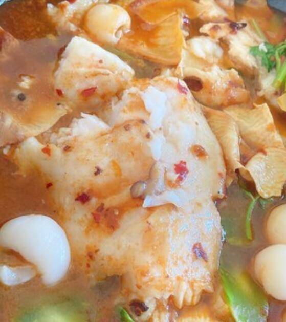 材料:鱼、姜片、葱、蒜、料酒、豆瓣酱、牛油火锅底料、干淀粉、水淀粉、荔枝罐头、莴笋、芹菜、油豆皮。