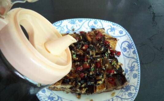 5、充分浸泡一段时间,让鱼干变软一点充分入味,然后将鱼干放入盘子中,汤汁倒掉,然后将盘子放入蒸锅中。