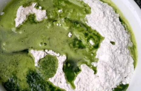 3、大碗中倒入500克面粉,5克酵母粉,50克白糖,1克的食用碱,再倒入菠菜汁,菠菜汁用筛子把它过滤一下,做出的馒头更细腻。