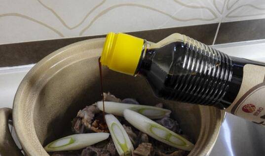 3、另起砂锅,放入焯水后的羊蝎子,放入葱段,放入淡盐酱油。