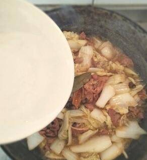 继续翻炒,直至白菜出汤。白菜基本不再出汤的时候加水。