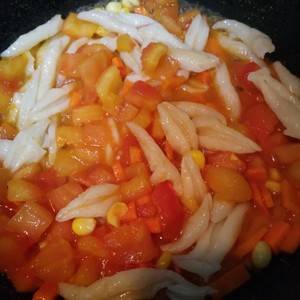用料:西红柿1个、面粉100克、水适量、玉米、胡萝卜1小段、青椒1个、油适量、生抽1勺、牛肉酱1勺、盐适量。