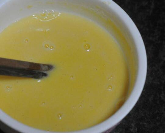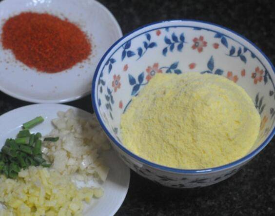 2.玉米面倒入大碗中,加入150毫升水,用筷子搅成糊状备用。