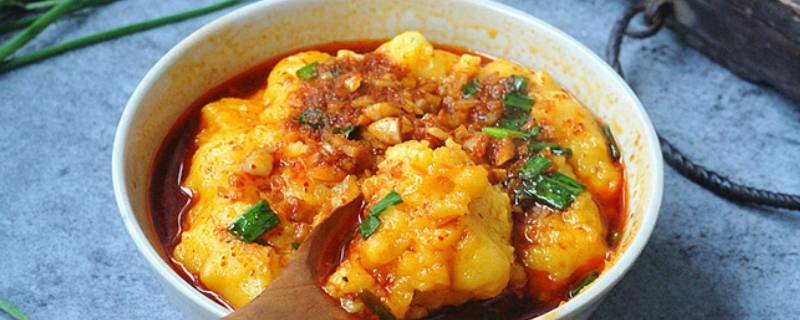 用料:玉米面粉80克、盐3克、水400克、香菜两根、大蒜适量、辣椒粉一勺、生抽适量、醋一勺、油适量。
