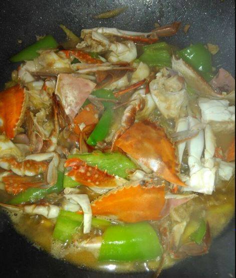 6、把螃蟹放下去炒制少会,倒适量料酒,生抽继续炒。