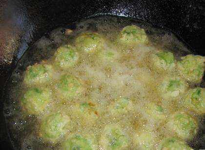 锅里放花生油,油烧到7成热,下入做好的丸子小火炸;