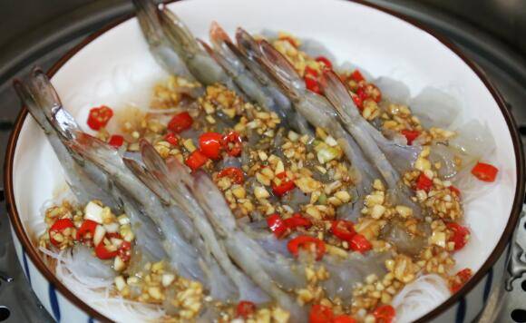 4、粉丝垫底铺在盘中,接着放上青虾并均匀的浇上料汁,然后放入蒸锅中,上气后蒸10分钟即可。