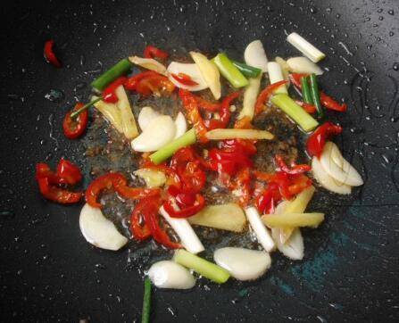 芹菜切段,葱、姜、蒜、泡椒备好。