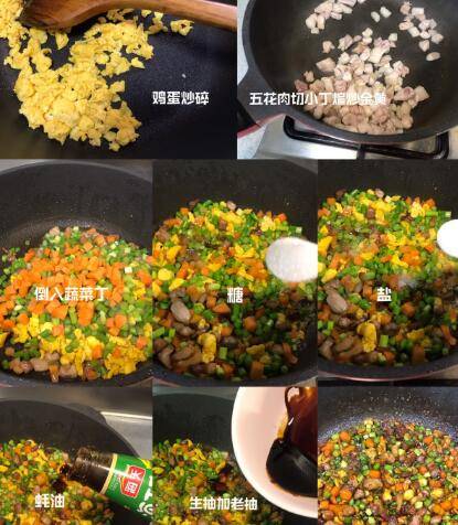 蒜苗、胡萝卜、五花肉切成碎丁,一个鸡蛋打散后在锅中炒碎,盛出备用。 锅中加少许油,倒入五花肉丁煸炒至面面金黄,再将蔬菜丁和鸡蛋碎一起倒进去翻炒,加入糖、盐、生抽、老抽、蚝油,翻炒均匀即可 因为是加进窝窝头里吃,所以稍微咸一丢丢也没关系,也可以炒小鱼辣椒,和窝窝头也是绝配。