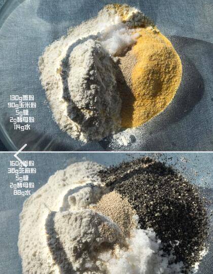 分别将玉米面窝窝头和黑芝麻窝窝头材料准备好,揉成均匀的面团。