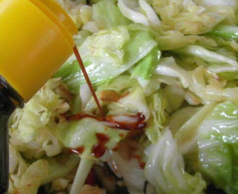 倒入包菜叶和辣椒翻炒,炒至七成熟时,倒入适量生抽,和盐继续翻炒。