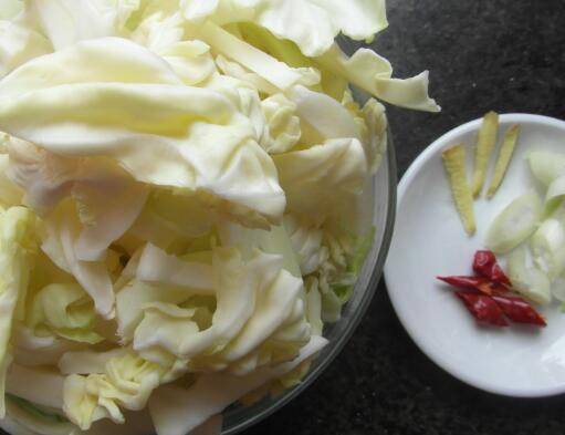 牛心包菜洗净后,手撕成小片,备好葱、姜、辣椒。