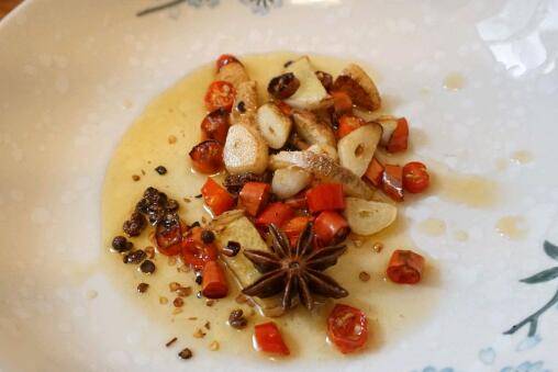 3、红辣椒、蒜、生姜、八角和花椒放油锅里炒香捞出备用。