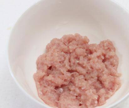 2、猪肉洗净后剁成猪肉糜,加入姜末、盐、鸡精、少许油,用筷子搅拌上劲备用。