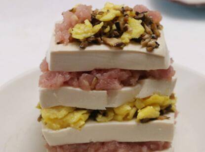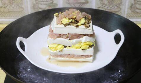 10、接着再放一片豆腐,铺上一层素馅。一层肉馅一层素馅直到最后一层。