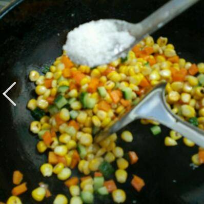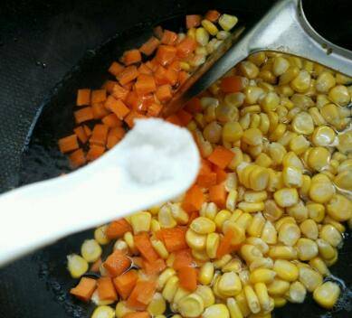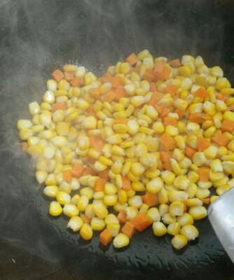 锅里放少量底油,放入玉米和胡萝卜翻炒。