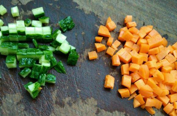 玉米全部剥下备用,松子剥干净备用,黄瓜和胡萝卜切小丁。