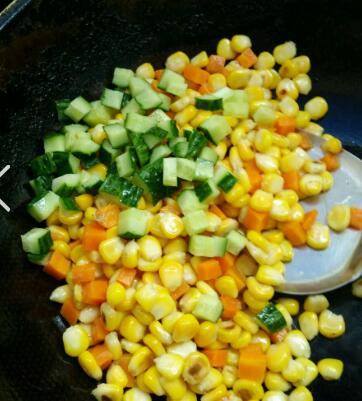 糯玉米一整根、胡萝卜一小截、黄瓜一小截、松子一小把、盐少许、糖一小勺、食用油适量。