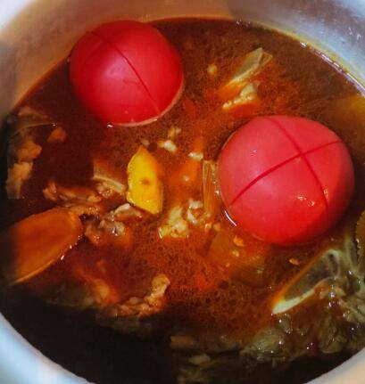 烧开的酱汁倒入牛骨砂锅中,放两个开了十字刀的西红柿。