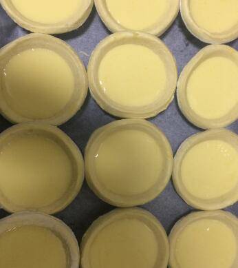 4、将混合好的蛋挞液过筛,加入蛋挞皮8分满。