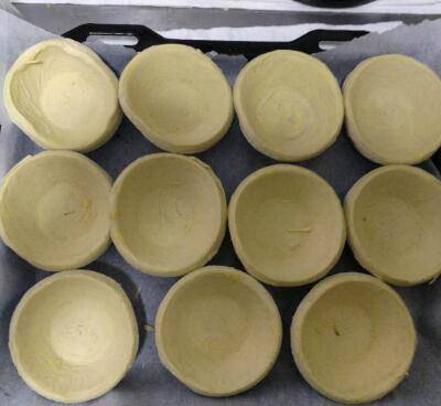 1、大号蛋挞皮常温解冻即可,摆烤盘待用,准备蛋挞液。
