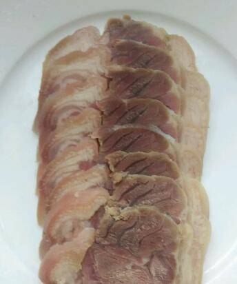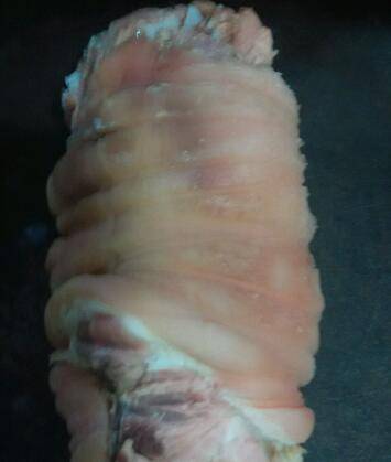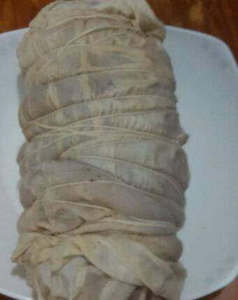 8、经过冷却后的蹄膀已成形,去除外包裹的布,露出真容。