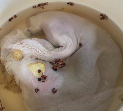 洗净的猪肚加姜,花椒,焯水约3分钟。捞出。