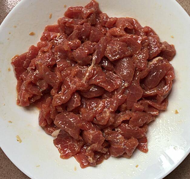2.牛肉,洗净后斜纹切薄片,加入料酒、蒸鱼豉油、胡椒粉、玉米淀粉和少量食用油。